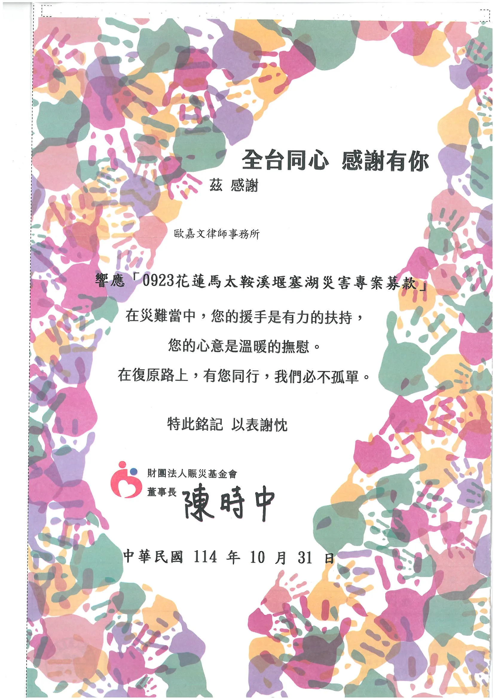 本所秉持專業服務之餘,亦持續關注社會脆弱族群之需求,積極參與公益事務。 針對「花蓮 0923 震災」事件,本所捐款支持災區救援與後續復原工作,日前已收到相關單位所致贈之感謝狀。