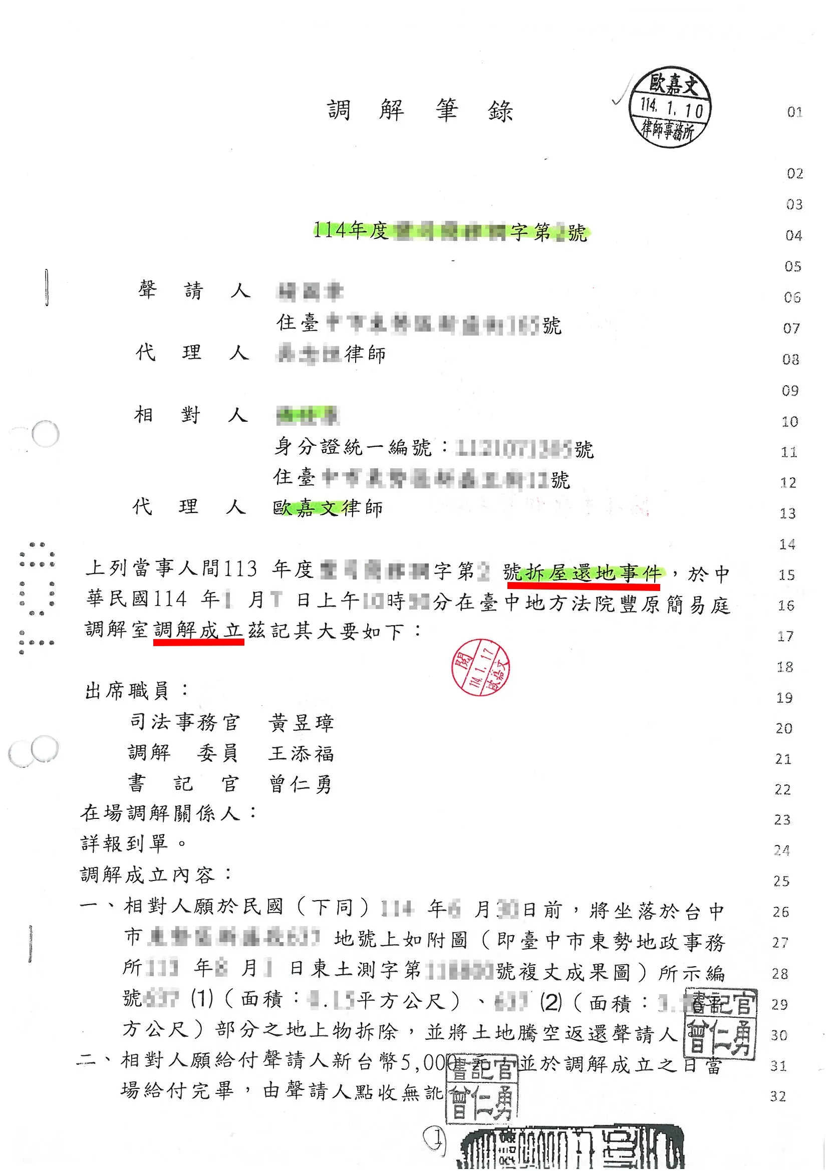 拆屋還地案件-調解成立∣豐原律師推薦∣潭子律師推薦