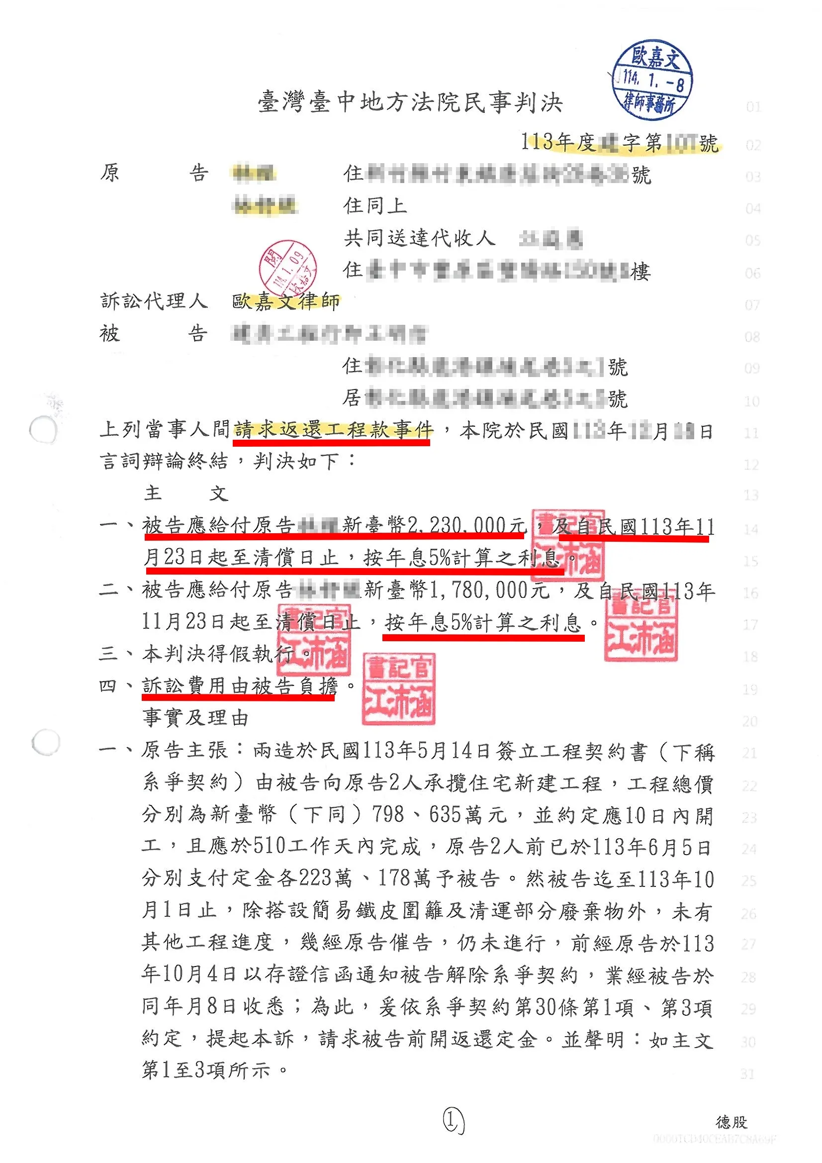 請求返還工程款案件-勝訴∣豐原律師推薦